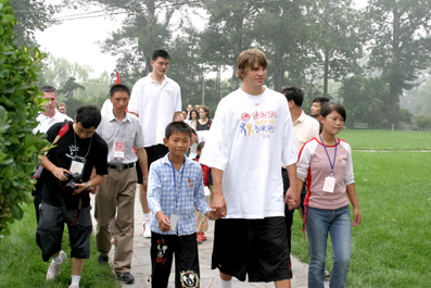 Yao and the NBA/FIBA players met with 30 Chinese children from the Fuyang AIDS Orphan Salvation, some of them HIV positive and others orphaned by AIDS. The children shared some of their stories about how HIV/AIDS had impacted their lives, and later the players and children exchanged gifts and shared lunch with a group of participates including renowned AIDS scientist Dr. David Ho, China’s AIDS ambassador Pu Cunxin.