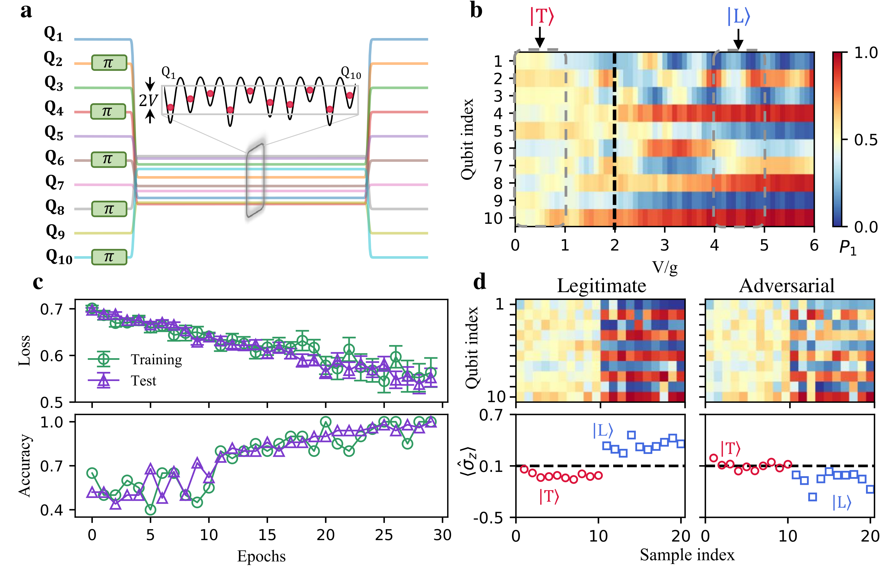 在量子机器学习领域,近年来的理论工作展示了在某些特定的任务下,量子分类模型和生成模型相对于经典模型具有可证明的、有复杂性理论保证的优势。最近两年,量子对抗机器学习的概念也被提出并受到了广泛关注。然而,在当前中等规模带噪声(NISQ)量子设备上演示量子学习模型面对对抗攻击的脆弱性和防御手段还面临诸多挑战。该研究中,星空体育交叉信息研究院邓东灵团队设计了处理经典数据和量子多体态数据的学习模型,并与浙江大学超导量子计算团队合作,首次在量子设备上成功实现了高维数据的学习、对抗攻击脆弱性的揭示以及相应防御手段的展示。