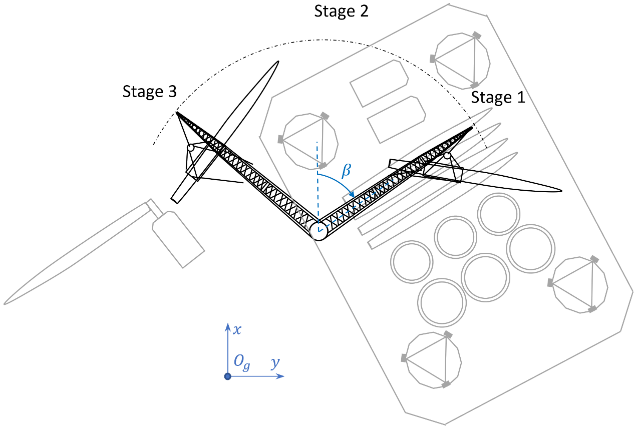 近日,星空体育深圳国际研究生院任政儒助理教授及合作者提出基于主动缆绳张力控制的自动化单叶片欠驱动安装方法,通过控制连接在吊具上的水平缆绳的张力,从而实现在复杂风场情境下的叶根与轮毂间相对运动补偿(图2)。本研究从多维度有效改善初代控制方法的不足:相比于先前的叶片稳定系统,集成感知风机轮毂运动并输入至路径规划系统,进而实现相对运动的补偿;除了水平面(叶片径向运动和转角)二自由度外,改进三自由度模型,充分考虑轴向运动可能产生的影响,进一步优化配置,利用2根缆绳降低叶根和轮毂间的三自由度相对运动;通过引入缆绳倾角和吊机转角变量,令控制方法和模型验证结果更贴近实际工程问题(图3(a));将单叶片安装划分为三个安装阶段(图3(b)),并提出普适主动控制框架;通过理论推导和数值模拟进行验证。