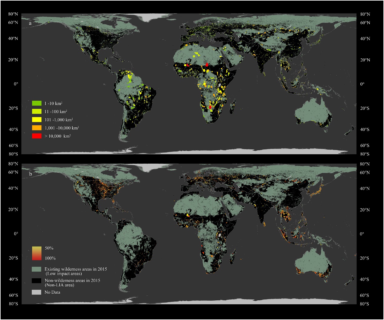 a.陆域自然保护地范围内的荒野地潜在损失区域面积。b.“自然保护地预警名单”中的受威胁自然保护地