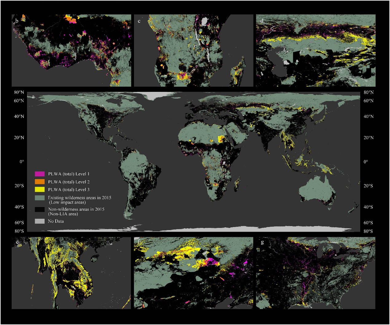 a-g.三个级别PLWA (total)空间分布。全球尺度(a),西非(b),南非中部(c),中亚(即欧亚草原)(d),东南亚(e),东北亚(f),美国中部和东部(g)