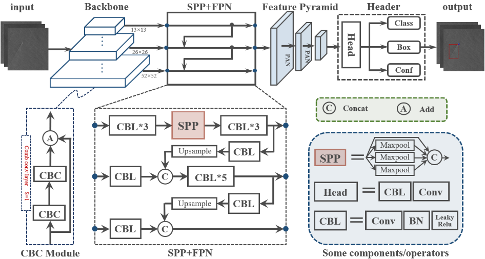 星空体育深圳国际研究生院周倩副教授、倪凯副教授课题组长期在微纳光学技术、光谱成像技术、光电精密测量技术等领域进行研究工作,从特种光学元器件、整机系统研制到现场应用进行了全技术链条攻关。针对上述问题,周倩、倪凯课题组提出了一种新的轻量级深度学习模型,用于实时检测舰船和尾迹。为了满足巡航任务中舰船和尾迹检测的实时性要求,本研究采用了单步法整体检测框架(图1),并开发了用于主干特征提取网络的组合卷积模块,以廉价的方式获得丰富的特征图像,在大大减少模型训练时间的同时也大大减轻了整体模型体积,满足了舰船检测系统的硬件要求。
