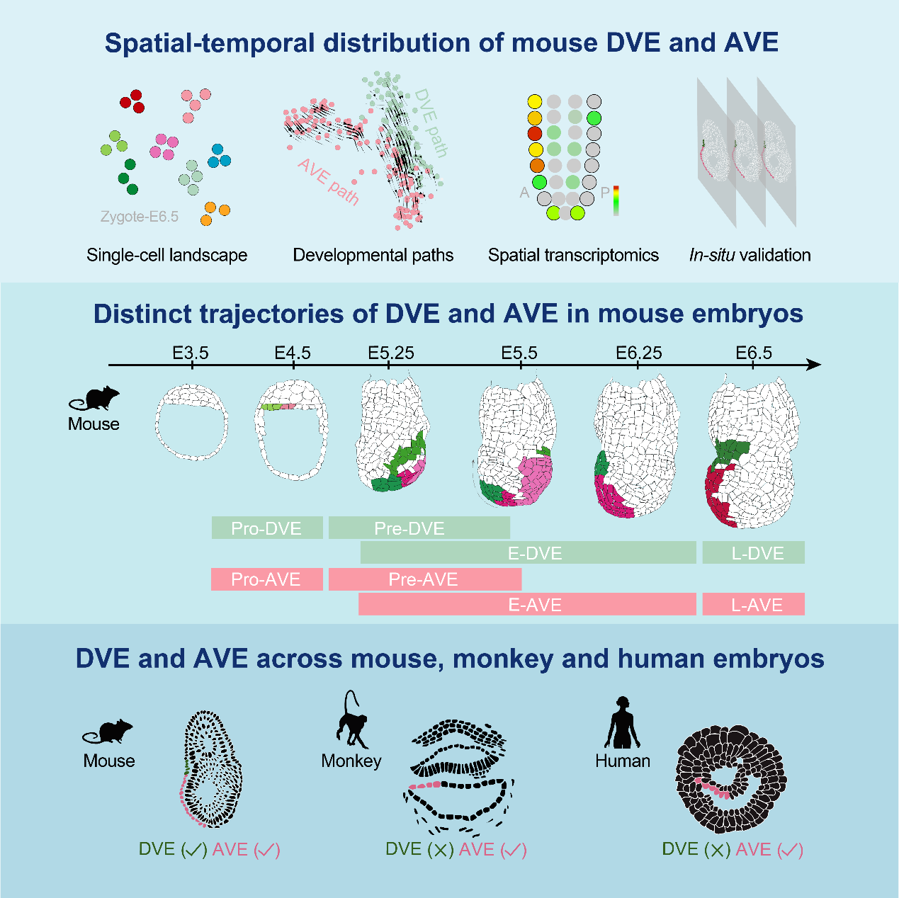 星空online(中国)网1月11日电 前后轴(anterior-posterioraxis,APaxis)建立是哺乳动物胚胎发育中的重要事件,该过程的异常将导致胚胎着床后发育失败与流产。着床后,小鼠胚胎远端内脏内胚层(Distal visceral endoderm, DVE)从远端向胚胎单侧迁移,而后定位于胚胎前侧,形成前内脏内胚层(Anterior visceral endoderm,AVE)。AVE释放的信号分子作用于临近的上胚层(epiblast,EPI),促进其特化具有胚胎体前侧的特征,而对侧EPI由于远离AVE信号而特化形成原条,至此胚胎前后轴正式建立。DVE和AVE作为前后轴形成过程中的关键细胞群体,经典理论倾向于认为它们是细胞迁移过程中同一类细胞的先后两种状态,即DVE是AVE的前体细胞;近年来也有研究提出DVE和AVE是同时存在的两类不同的细胞,且AVE可能来源于非DVE细胞。为此,DVE和AVE具体的起源和特化模式,以及对应的分子调控规律有待进一步揭示。