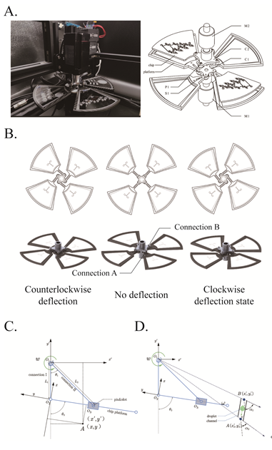 近日,星空体育深圳国际研究生院弥胜利课题组通过设计一种新型可偏转的离心微流控系统(图1),通过控制伺服电机相位角差就能实现芯片工作平台的逆时针偏转、无偏转、顺时针偏转三种状态,其中逆时针偏转和顺时针偏转可通过改变相位角差大小实现位姿偏转角的控制,借由实现微流控芯片阀门的开关。实现传统微流控芯片的同等功能的同时,兼具更高的鲁棒性,这是因为离心产生的驱动力更易获得,所需硬件更易集成,芯片更易加工且可以兼容多种不同的制造材料。