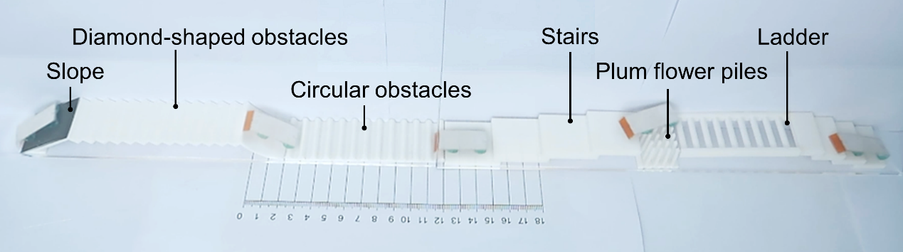 微型机器人可集成多种功能模块和精细机械结构实现越障。若采取闭环的精准运动控制,时间迟滞会导致准静态越障;而用机械结构补充开环控制,能在无神经调节的被动力学下快速越障。课题组在昆虫级别柔性机器人有限的身体空间中设计了类环状曲面腿的机械结构(图1),依靠主体形变,机器人的腿-地机械作用产生“弹性步态”穿越三维复杂地形。通过仿真模拟和对比实验,设计出了具有75度固定迎角的前腿前部理论曲线,保证了碰撞台阶过程中阻力不增大、升力不减小。提出了封闭度100%的类环状腿结构,保证顺滑通过小尺寸障碍物地形,并通过非对称的整体结构,提高振动-前进力的转换比率。采用“辐条式”结构,利用全柔性材料制成的半刚性腿部结构,兼顾了形状的稳定性、抗跌落的结构鲁棒性和抗意外扰动的运动适应性。实验表明,环状腿机器人能在0.36倍身高的矩形凸起地形上保持4身长/秒以上的爬行速度;能实现以100%概率通过5毫米(1.2倍身高)台阶、64%概率通过8毫米(1.9倍身高)台阶;还能穿越镂空梯子、梅花桩等地形(图2)。该研究为小型越障机器人的运动开环控制提供了思路,腾挪了感官控制的操作空间,能够为同类型越障机器人提供参考。
