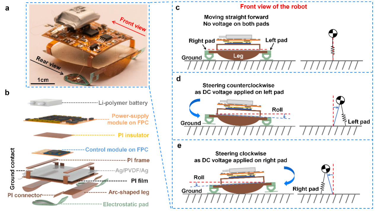 图3.基于摩擦力调控的无缆微型柔性机器人转向原理。(a)可转向无缆柔性机器人原型样机,(b)机器人结构爆炸图,(c)静电足垫工作原理,(d)-(f)机器人直行、逆时针旋转和顺时针旋转时的运动状态