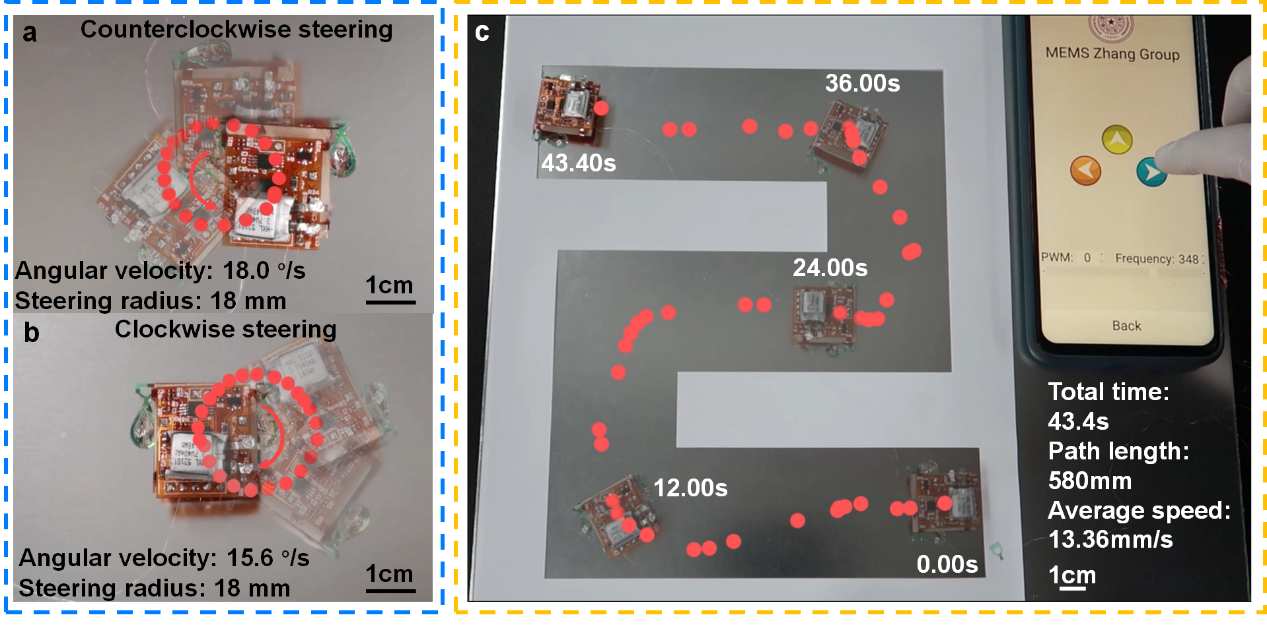 受限于柔性执行器驱动力弱、功率密度低、柔性机构传动精度差的问题,现有的微型柔性机器人仍以拖缆驱动为主,机器人的灵活性和活动范围受到限制,在无缆条件下实现快速运动和敏捷的轨迹控制仍是巨大的挑战。课题组在原有有缆柔性压电机器人的基础上,设计了小型化压电驱动电路系统、负载携带结构和反馈控制单元,实现了柔性压电机器人的无缆驱动(图3)。根据柔性机器人的运动特点,提出了用于携带驱动电路系统和电源的悬架式负载结构,可有效减小负载对机器人运动的影响。通过仿真和实验分析了柔性机器人带负载条件下的特征频率和运动模态,以机器人运动性能为目标优化了悬架负载结构,实现了无缆条件下机器人2.5身长/秒的快速直线运动。为实现机器人的灵活轨迹控制,提出了静电足垫与圆弧形腿相结合的转向控制策略,利用转向时的机器人侧倾,实现了机器人载荷在腿部和静电足垫上的重新自分布,自动调节转向过程中不同足垫上的摩擦力,实现了无缆柔性机器人的敏捷转向(图4),转向速度达到18°/s,机器人能够在43.4秒内通过58厘米长的S形通道。通过低功耗设计,机器人在装配有40mAh的锂电池时,能够连续运行58.6米,对应的机器人运输能量成本(Cost of Transport)仅为261,优于已报道的绝大多数柔性无缆机器人。该研究为昆虫尺寸的柔性机器人实现无缆化的敏捷运动和实用化研究提供了解决方案。