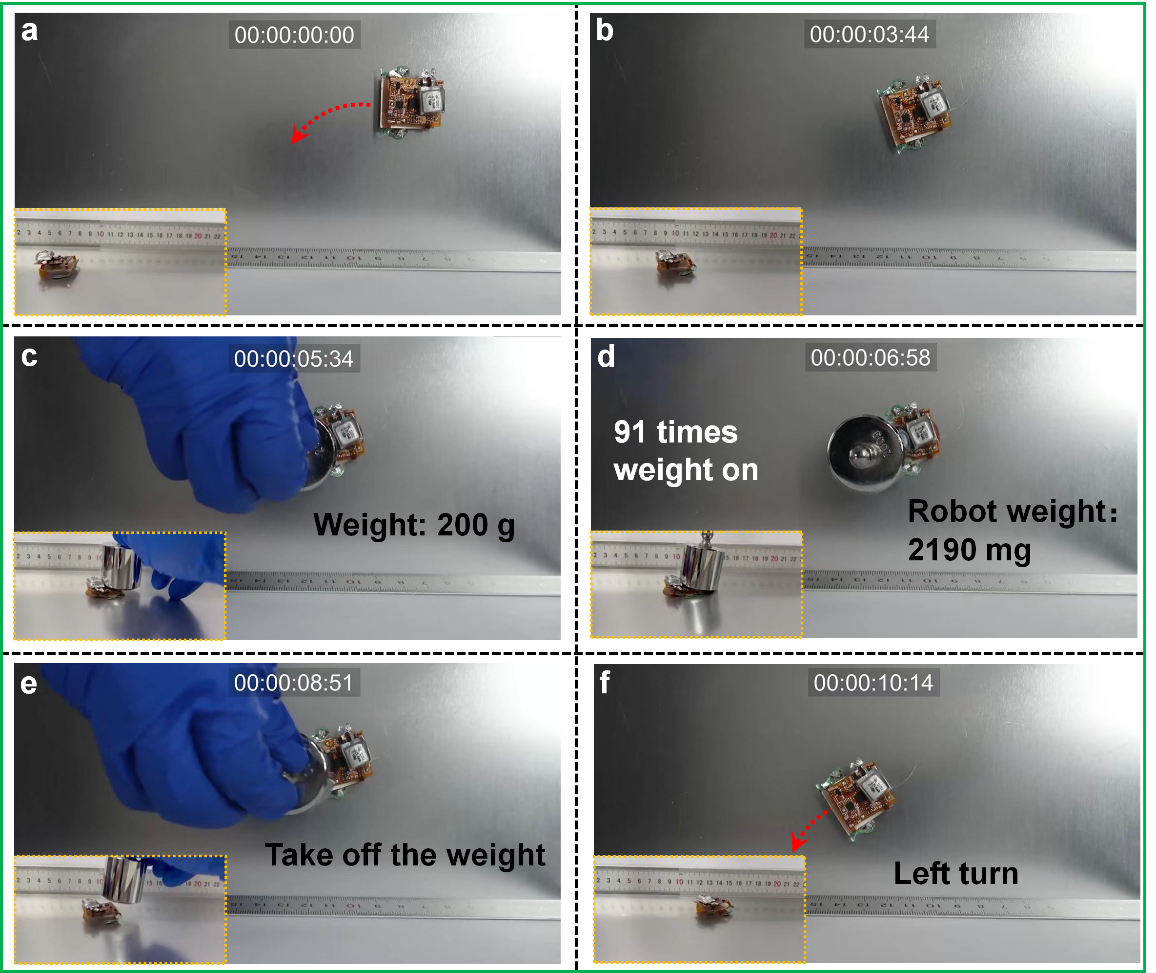 图5.机器人鲁棒性测试,机器人在经受200g砝码挤压时能够快速恢复并保持良好的机动性。(a-f)展示了机器人在被压缩和恢复运动的过程影像