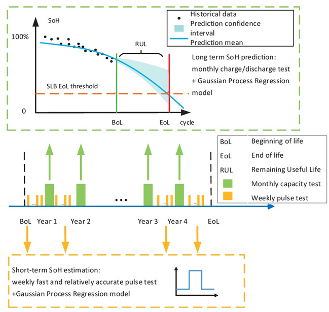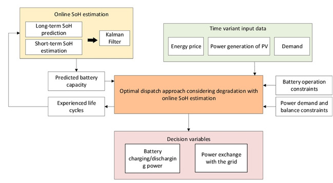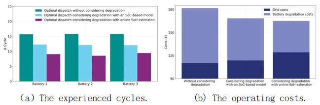 研究团队结合快速脉冲测试和机器学习方法,提出了针对锂离子电池的快速一致性筛选与剩余容量评估框架。与传统的长时间充放电测试相比,所提出的框架可以将评估时间缩短80%以上,平均准确率可达95%。过往研究表明,快速脉冲测试可以反映电池随着老化加深时内阻和电压平台的变化,从而反映出电池的老化程度。当给定一批容量未知的“退役电池”时,只需对其进行快速脉冲测试,将得到的脉冲电压曲线输入上述评估模型,即可输出其容量估计值。在此基础上,张璇、韦国丹、周光敏团队提出了一种基于电池健康状态(State of Health, SoH)在线评估的梯次利用电池优化调度模型。该模型使用卡尔曼滤波方法,通过结合基于高斯过程回归的离线健康状态预测和基于快速脉冲测试的在线容量评估,实现了梯次利用电池容量和退化速率的精准估计,并将该估计数据带入电池优化调度模型,从而生成计及可靠性及成本的光储系统优化调度方案。