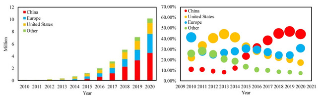 图1.2010-2020全球电动汽车销量及市场份额