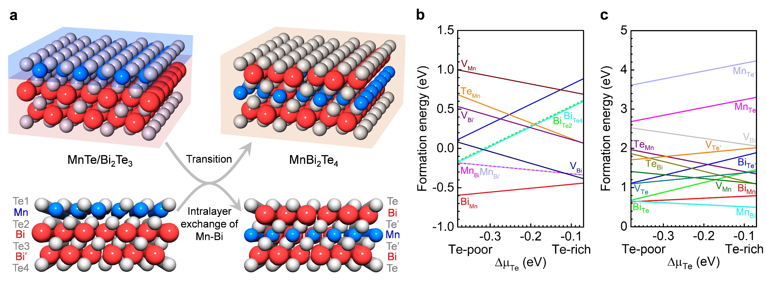 近日,星空体育深圳国际研究生院李佳课题组及合作者深入研究了MnBi2Te4制备的相变过程和相应的能带演化过程。首先,课题组成员选取MnTe/Bi2Te3和MnBi2Te4单层作为相变模型来研究其Mn-Bi交换的过程,并发现MnBi和BiMn反位缺陷是相变过程中的主要缺陷(如图1),与实验观察的结果一致。