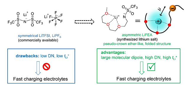 图1.商业化锂盐与设计合成的非对称锂盐(LiFEA)的化学结构与优缺点