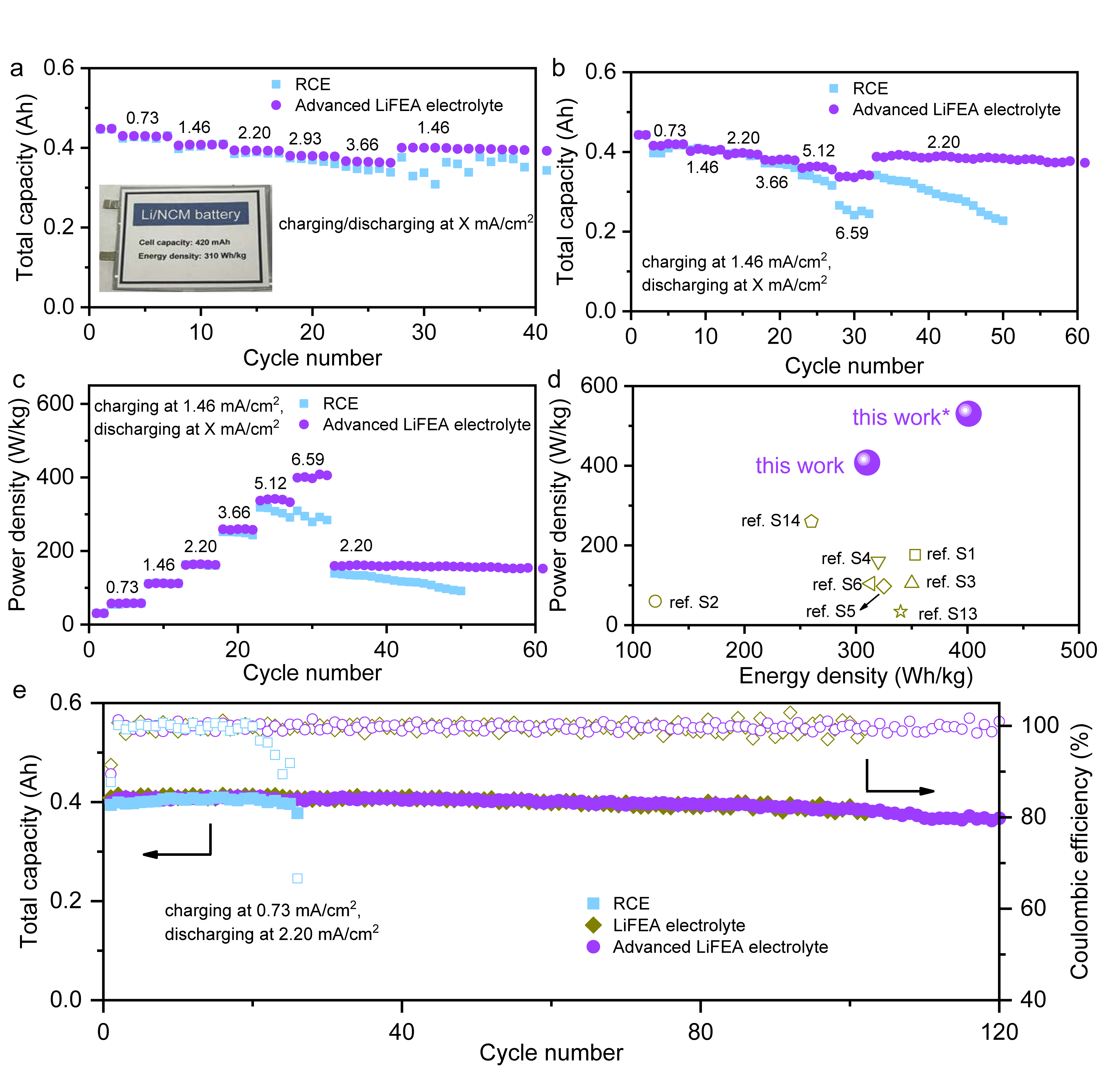 图2.在实际、严苛的条件下,Li||NCM811软包电池在LiFEA基商业碳酸酯电解液中的循环性能