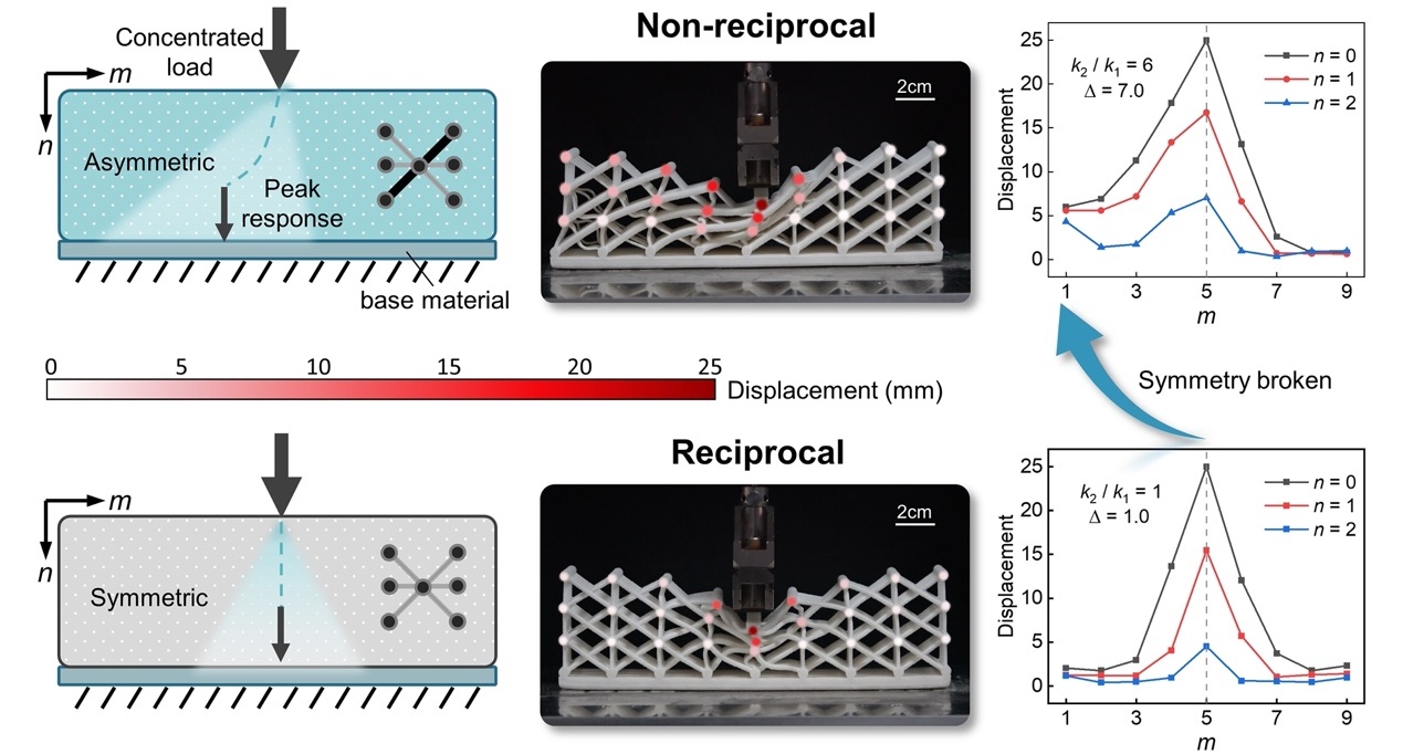 最近,星空体育航天航空学院陈常青教授课题组利用力学超材料点阵结构,将低维非保守系统中的弹性波时域动力学演化行为,等效映射为空间尺度上高维点阵结构的静态变形模式,从而在一个静态的保守系统中实现了非厄米拓扑效应(图1)。相较于非厄米动力学系统,该静态系统中仅通过改变点阵的几何构型便能实现非厄米及等效非互易效应,而无需任何主动调控或能量注入,极大地降低了非厄米效应的触发条件(图2)。