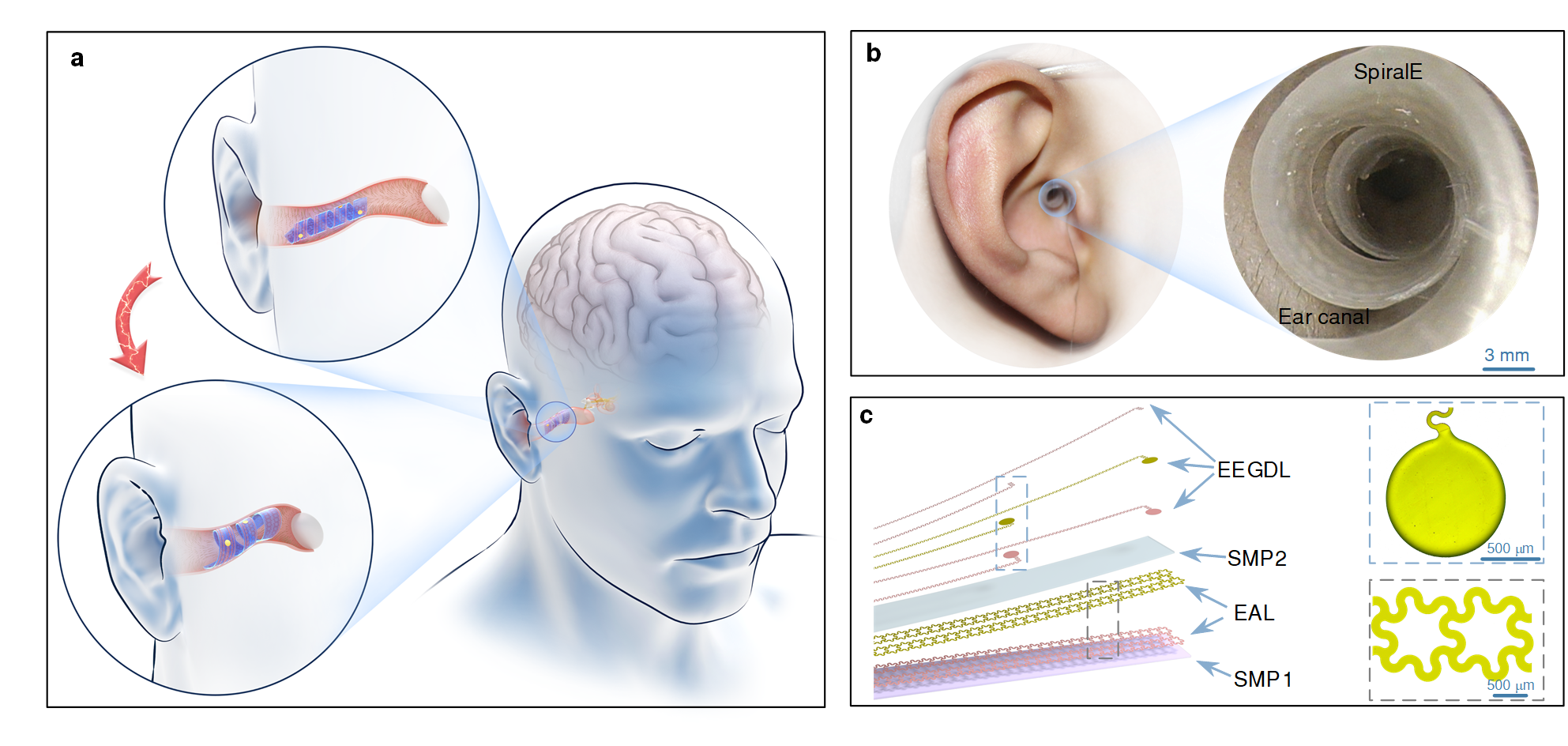 外耳道内部蜿蜒曲折的几何形貌以及因人而异的特点,对力学、材料、界面及电子器件的设计提出极高的挑战;此外,实现耳内脑电信号的连续监测而不影响听觉信息的正常传导也对电子器件的形态提出极高的挑战。研究人员基于柔性电子器件可与神经界面共形集成的特点,发展了一种自适应、自支撑的耳内柔性三维附壁攀爬神经电子器件,解决了上述挑战。该器件以小螺旋的构型深入外耳道,在电热驱动下膨胀并变形为预设大螺旋构型,受到耳道内壁的约束后自适应地贴合于耳道内表面。其模量可调节的特性平衡了外耳道的生理敏感同信号采集所需界面稳定的矛盾,形态可重构的特性解决了传统支撑物需量身定制的难题,同时其中空的结构不影响受试者与外界的沟通与交流,为开发适用于三维复杂表面/结构的柔性电子器件提供了崭新的思路。