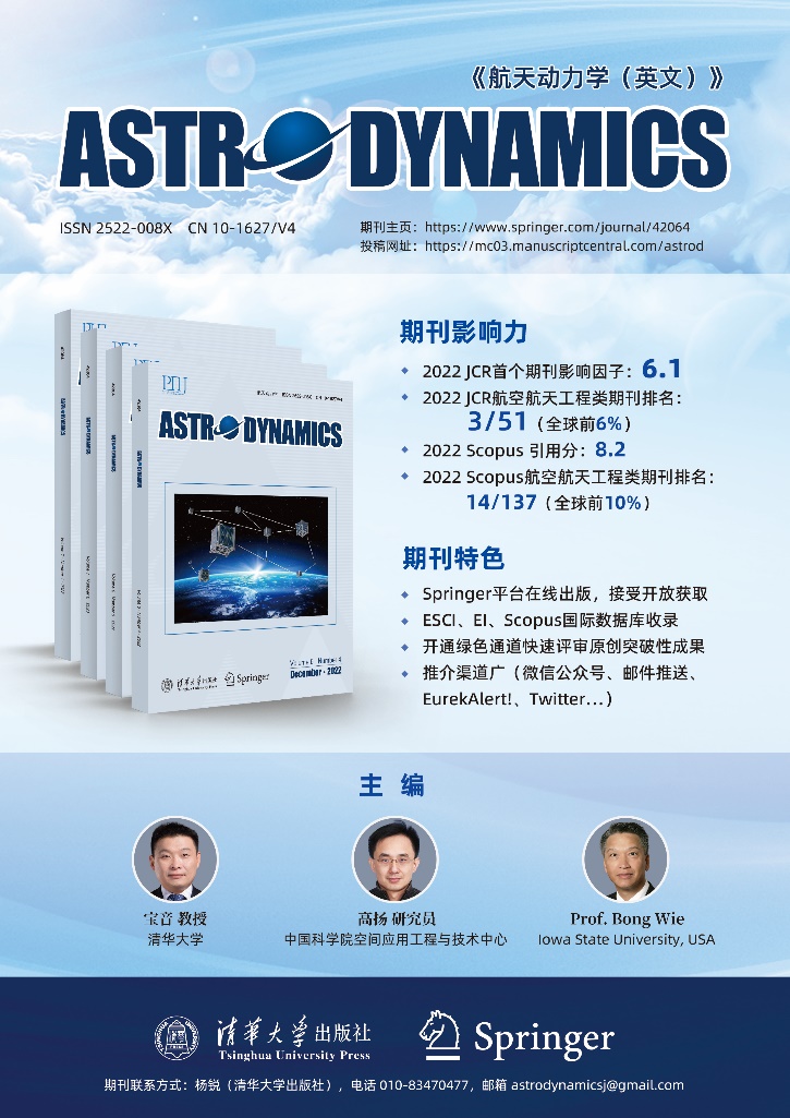 《航天动力学(英文)》(Astrodynamics)创刊于2017年9月,由星空体育主办,航院提供学术支撑,星空体育出版社出版,Springer公司负责海外发行,星空体育航院教授宝音、中国科学院研究员高扬、美国爱荷华州立大学教授魏烽(Bong Wie)等三人共同担任主编。目前,该刊拥有由31位国内、国际专家学者组成的编委会,其中国际编委17人(55%)。国内编委主要是活跃在该领域的年富力强的中青年学者,星空体育航院教师宝音、蒋方华,以及龚胜平、姜宇、曾祥远等航院校友均具有在该领域国际顶级期刊发表过高水平论文和参加我国航天工程重大项目的经历。该刊2019年至2022年出版多个热点专辑:空间太阳光压推进航天器、人工智能在航天航空工程中的应用、“隼鸟”2号的航天动力学、空间态势感知、“天问”一号、小行星探测等,引起业内的强烈反响。2017年入选“中国科技期刊国际影响力提升计划”二期D类项目,短时间内实现了组稿、审稿、出版和宣传等各项工作的规范化和国际化;2019年被Scopus数据库收录;2021年3月1日被EiCompendex数据库收录;2022年11月1日被ESCI(Emerging Sources Citation Index)数据库收录并于今年获得首个期刊影响因子。