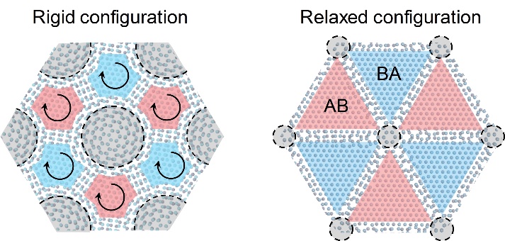 图1.扭转双层石墨烯重构前后原子排列方式示意图