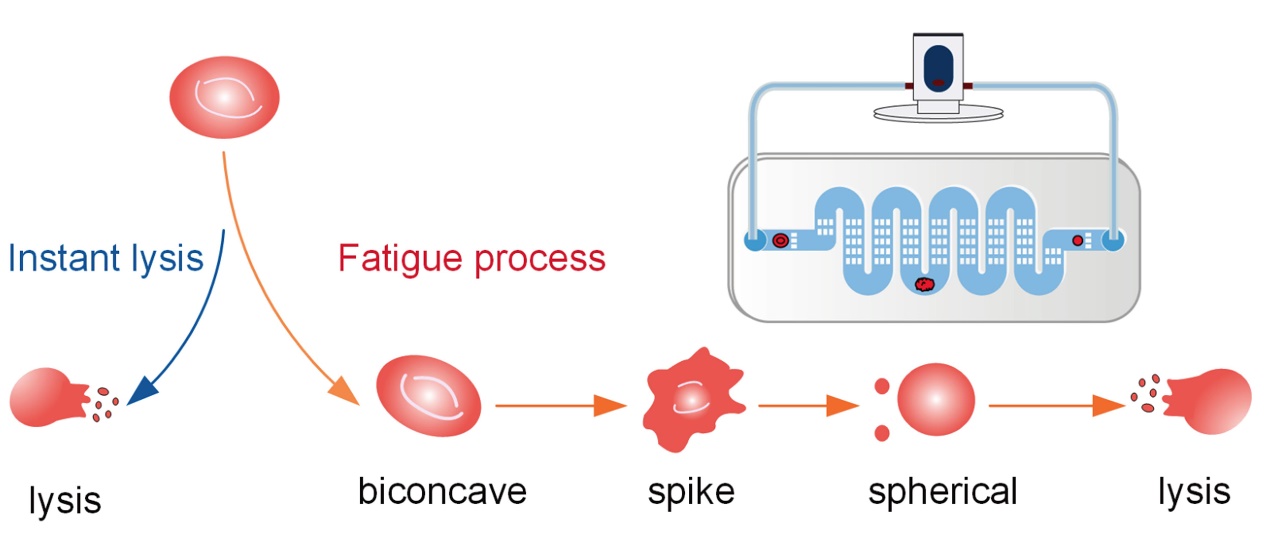在该研究中,研究者首先在体外膜肺氧合患者临床血液标本中观察到除了正常双凹形态的红细胞以外,还存在棘形和球形的异常形态红细胞,且随着治疗时间的增加,异常红细胞在血液中的比例逐渐上升,同时病人出现了游离血红蛋白浓度缓慢升高的溶血现象。研究者通过专门设计的微流控芯片装置模拟了体外膜肺氧合中循环挤压红细胞的过程,并通过高速相机捕获到了红细胞的形态变化,发现红细胞疲劳过程分为双凹、棘形、球形和破裂溶血四个阶段。并且,随着其形态变化,红细胞的杨氏模量增加,变形能力降低,呈现疲劳累积现象,并最终出现溶血。