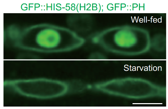 欧光朔实验室意外地发现在饥饿期间线虫(Caenorhabditis elegans)中的组蛋白H2B会全面降解。欧光朔实验室通过遗传筛选识别出在饥饿动物中阻止H2B降解的泛素和与泛素相关酶的突变,确定赖氨酸31是染色质结合H2B泛素化和消除的关键残基。在饮食充足的动物中,当胰岛素/IGF信号减弱时,保留异常的核小体H2B增加了FOXO转录因子DAF-16与染色质的结合,生成有害于动物生存的非正常基因表达谱。这项工作还报道了泛素-蛋白酶体系统在人类细胞中调控染色体组蛋白的更新。在幼虫发育过程中,表皮细胞在与上皮细胞融合后也会进行H2B更新。这些结果提示组蛋白系统性降解可能是控制表观基因组动态变化的普遍机制。
