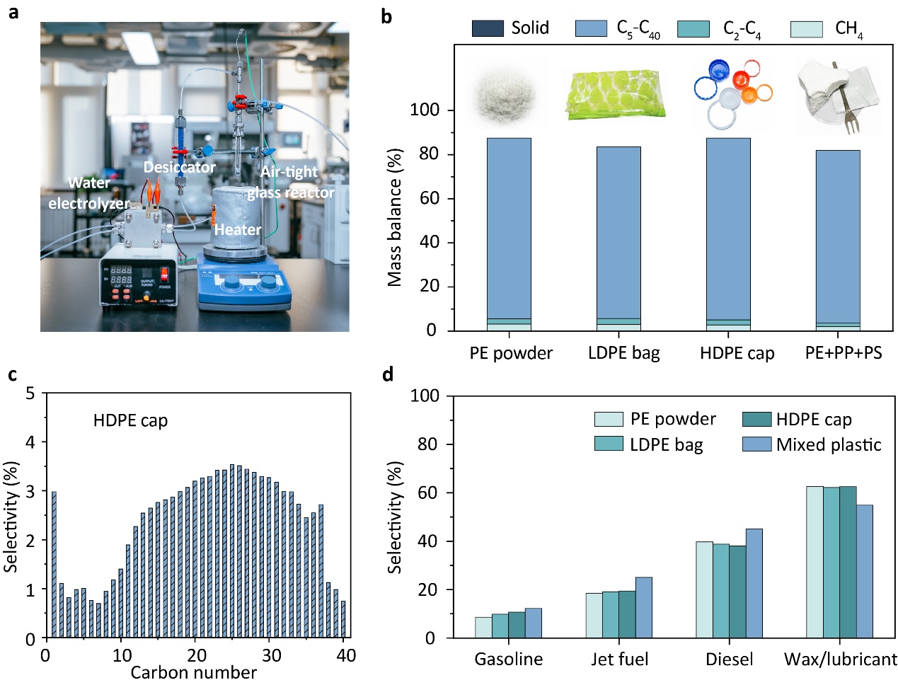 近日,星空体育化工系牛志强课题组在废旧塑料催化升级回收领域取得重要进展,在低氢气压力甚至常压条件下,将废弃聚乙烯(PE)高选择性地转化为液体燃料、蜡和基础油,提出并验证了“绿氢+废塑料=液体燃料”的分散式资源升级回收路线(图1)。