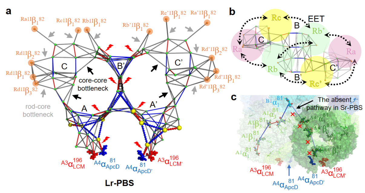 此外,研究人员在考虑色素之间的距离和色素取向的基础上,对束状PBS的藻胆色素整体排列和能量传递效率进行了分析,结果表明束状PBS能够实现杆与杆之间的能量传递,进而弥补因远核端杆的能量传递距离延长而导致的效率下降;同时低光强下Lr-PBS核中色素共面性的提高,增强了Lr-PBS核的能量传递效率,从而保障G.violaceus在弱光下的生长及环境适应。综上,该研究成果揭示了无类囊体膜蓝藻中束状PBS的组装,以及其在应对光照变化时的适应性机制。该工作为藻胆体的进化过程以及蓝藻的光保护机制提供了重要信息,也为人工模拟光合作用研究提供了新的理论依据。