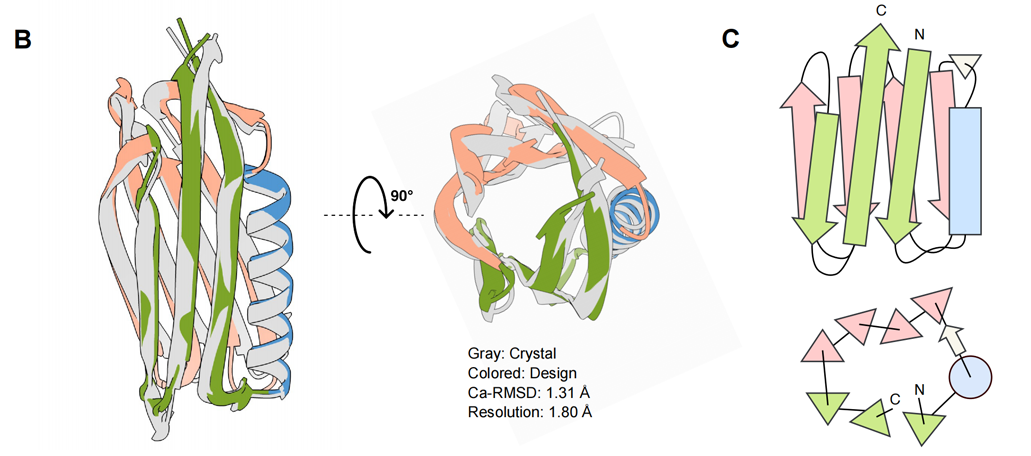 为了最终检验TopoDiff在真实世界中的设计潜力,团队挑战了设计全新拓扑β蛋白这一公认难题。利用模型的可控生成能力,团队在计算层面高效地筛选出候选设计,并通过多种实验手段,验证了多个设计具有明确的单体状态、正确的二级结构和出色的热稳定性。其中,设计B10的高分辨率X射线晶体结构被成功解析,其结构与计算模型高度吻合,更重要的是,其展现出一种在自然界中前所未见的全新蛋白质拓扑结构。这一“从计算到现实”的成功闭环,强有力地证明了TopoDiff有能力突破自然演化的边界,探索并创造全新的蛋白质结构宇宙,为未来功能分子的理性设计开辟了新的道路。