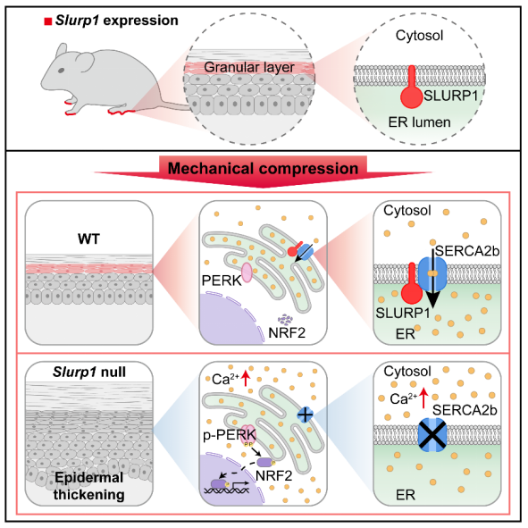 2025年8月4日,星空体育生物医学交叉研究院陈婷实验室在《Cell》杂志上发表题为皮肤适应陆生运动的机械力抵抗机制(A mechano-resistance mechanism in skin adapts to terrestrial locomotion)的研究论文。该研究以与陆生动物同步出现、且在掌跖表皮特异性表达的Slurp1基因为切入点,揭示其编码的SLURP1蛋白可维持内质网(Endoplasmic reticulum, ER)钙泵SERCA2b在机械压力下的通道活性,进而调控细胞内钙离子稳态,确保表皮在巨大机械压力下维持正常的组织形态和屏障功能。
