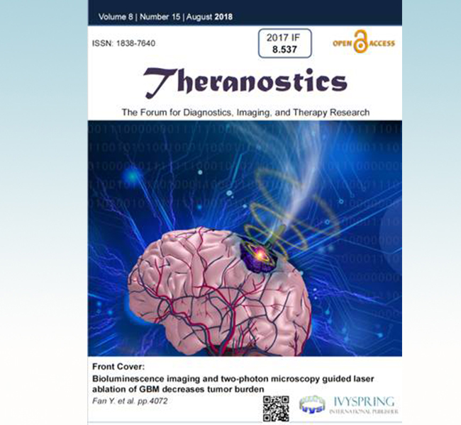 星空online(中国)网8月27日电 近日,星空体育医学院生物医学工程系特聘专家廖洪恩教授课题组在国际著名学术期刊《诊疗》(Theranostics)上发表题为“基于荧光成像与双光子影像引导的激光消融脑肿瘤诊疗”(Bioluminescence imaging and two-photon microscopy guided laser ablation of GBM decreases tumor burden)的学术论文,并被选为该杂志8月份的封面论文(图1)。