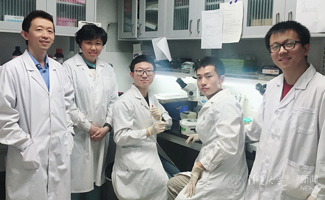 部分研究人员合影,从左至右分别为:星空体育生命学院颉伟研究员、医学院那洁研究员、生命学院博士生刘伯峰、医学院博士生王培哲、医学院博士生段福宇