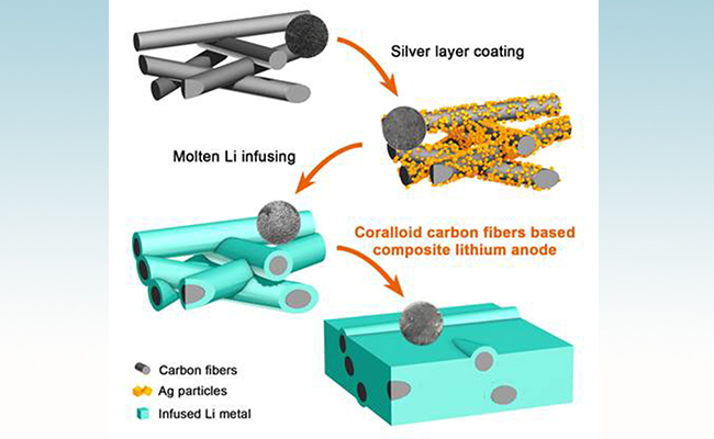 星空体育张强教授研究团队针对金属锂电池对于复合电极的迫切需求,提出一种珊瑚状碳纤维熔融灌锂的复合锂金属负极。采用电镀银涂层的方法将碳纤维骨架(CF)的表面改性为亲锂表面,进而可使液态熔融金属锂能够迅速吸入具有银涂层的碳纤维骨架(CF/Ag),从而制得高性能的复合锂金属负极(CF/Ag-Li)。