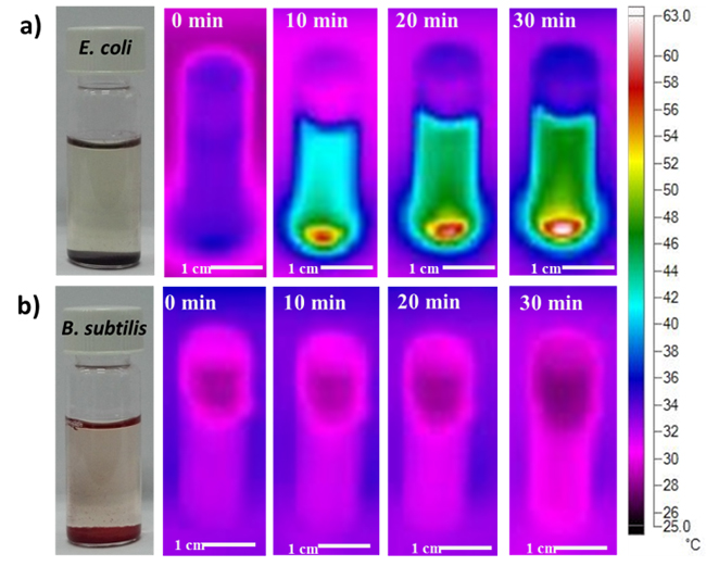 图2. 与超分子复合物共培养之后的大肠杆菌(a)和枯草芽孢杆菌(b)在近红外光照射下的温度变化及存活率。
