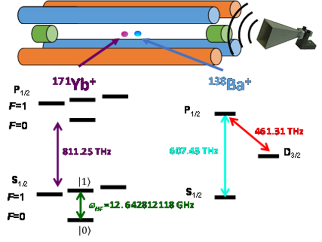 单离子系统相干时间不长的主要原因是加热。在没有激光冷却的环境下,离子被环境噪声加热,从而降低了量子态探测的效率。此项研究在实验中利用协同冷却技术解决加热的问题,用138Ba+离子冷却171Yb+离子(量子比特离子)。由于138Ba+离子拥有和171Yb+离子相似的质量,协同冷却效果显著。又因为138Ba+离子的冷却激光波长距离影响171Yb+量子比特的波长很远,所以协同冷却过程不会影响量子比特的相干性。同时研究组施加了上千个动态解耦操作以抵抗环境的磁场噪声,从而延长相干时间。该研究工作的单量子比特操作保真度达到99.99%。最终研究组制备了6个初始量子态,并测量了它们的相干时间。如下图所示,|↑>和|↓>的相干时间为4,740±1,760秒,其它四个态的相干时间为667±17秒。