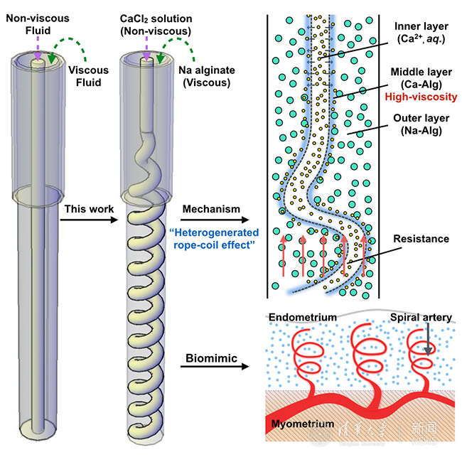 星空online(中国)网9月19日电 9月13日,清华化学系梁琼麟研究组在《先进材料》(Advanced Materials)发表基于微流控的生物材料制备技术研究的新成果,并作为当期杂志内封面(《先进材料》. 2017, 29, 1701664)。该研究首次报道了含螺旋血管通道的生物水凝胶纤维的生成技术,实现了血液灌注功能及物质输运扩散动力学的研究,并提出了结合微流控反应与微流体力学的“异质生成卷绳效应”,为含螺旋通道或直通道的水凝胶纤维的可控制备奠定了理论基础。