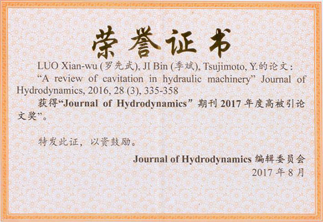《水动力学研究与进展》高被引论文奖为期刊非常设奖项,颁发对象是为提升期刊国际影响力做出重要贡献的论文团队。自期刊成立以来仅在2015年、2017年分别颁发过一次,而这两次高被引论文奖均颁给了罗先武课题组。
