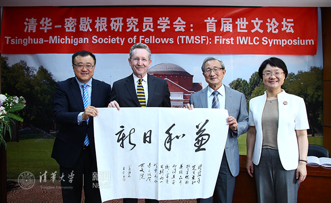 胡显章发表了题为“肩负重任,传承创新”的演讲。他说,中国必须置身国际文化交融的前沿,获得把握“跨国对话”“中国叙述”的主动权。清华外文系的改革和世文院的设立正是该形势下的一个重要步骤,是对清华文化传统的继承。他提出世文院的开拓创新要抓好不断激发创新意识、不断开拓世界眼光、不断增强人文关怀三个环节。胡显章还向清华-密歇根研究员学会赠送了他亲笔书写的书法作品——“兼和日新”。