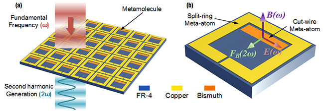 本研究成果中提出的人工材料基于一个巧妙设计的人工超构分子(metamolecule)内部电场和磁场的耦合,打破了材料物理环境的空间对称性,从而实现了人工设计的光学非线性。其非线性完全源于人工超构分子,而无需自然光学非线性材料参与,因此可以通过改变人工结构,对所产生的光学非线性进行精确的设计和调控。同时,该人工非线性理论的物理过程明确且清晰,可应用于非常宽的电磁频谱。相关研究结果表明,通过适当的缩放超构分子结构的几何尺寸,在微波到红外波段均可以产生明显的光学非线性。这一全新的人工理论,使得光学非线性具有了前所未有的设计自由度,将极大的促进新一代光源及光信息技术的快速发展,同时也将促进如非线性光学透镜和非线性全息等新技术的产生和发展。