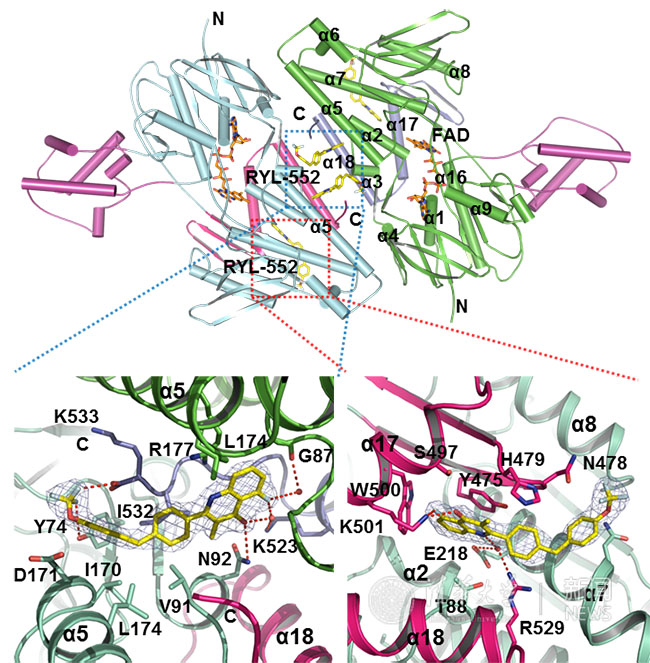 现有抑制剂溶解度极差,并导致其几乎不可能与靶蛋白共结晶,研究人员首先对已报道的化合物进行了大量的亲水性化学修饰发现了活性更好的化合物RYL-552和RYL-552S。并首次解析了Apo、以及分别结合底物NADH和药物分子RYL-552等的PfNDH2的高分辨率晶体结构。研究人员通过大量生物化学、生物物理学、分子生物学、药物化学构效关系等研究阐明了RYL-552是通过别构调节对PfNDH2产生抑制作用。研究工作发现RYL-552和RYL-552S对九种从四大洲收集来的耐药疟原虫株都具有很好的抑制作用,且对细胞毒性较低。动物实验亦具有很好的治愈效果且与青蒿素有协同抗疟疾作用,因此具有与青蒿素联合用药发展新的疟疾治疗方法的潜能。此研究成果不仅提供了一种全新的可用于联合用药的抗疟药物分子,为有效地治疗耐药疟疾奠定了重要的研究基础,更开辟了一种利用II型复合物I作为药物靶点的全新的研究思路。