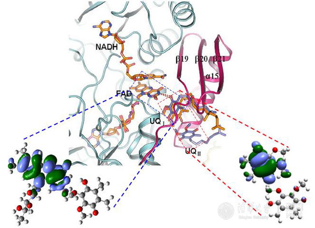 结果表明,在Ndi1蛋白电子传递过程中,FAD中间体自由基的b自旋与UQI半醌自由基的a自旋之间存在着自由基AFM相互作用,当UQI接受了从FADH2依次传来的两个电子,又将电子依次传递给UQII,在这一过程中,半醌自由基对(UQI-UQII)之间也存在着AFM量子行为。进一步的量化计算和生物功能数据表明,Ndi1催化的电子传递过程中的AFM效应是源于辅基·键堆积(stacking)间的through-space交换相互作用。这一研究结果不仅从机理上阐述了Ndi1中的具体电子传递机制,也为研究和应用生物分子的磁学性质提供了新的思路。