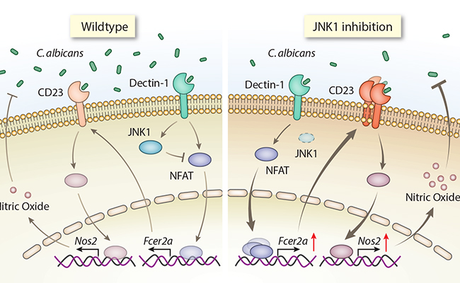 星空体育医学院林欣实验室在近日在《自然 医学》杂志上在线发表题为《JNK1通过抑制C型凝集素受体CD23负调控抗真菌天然免疫反应》(JNK1 negatively controls antifungal innate immunity by suppressing CD23 expression)的学术论文中发现,JNK1基因敲除小鼠在临床上最为常见的深部真菌感染、白色念珠菌感染后,其生存率相对于野生型对照小鼠明显增加,同时在野生型小鼠中应用JNK抑制剂后小鼠对于深部真菌感染的生存率也显著增加。其具体机制为,巨噬细胞表面C型凝集素受体Dectin-1识别酵母态的真菌,激活胞内NF-κB、NFAT等信号;当JNK1基因敲除或表达被被抑制情况下,转录因子NFATc1活性增强,NFATc1可结合到C型凝集素受体CD23的启动子区显著上调其表达;高表达的CD23可以识别真菌细胞壁表面成分α甘露聚糖和β葡聚糖,并介导巨噬细胞分泌更多的一氧化氮来杀伤真菌。重要的是,两种JNK抑制剂SP600125和JNK-IN-8在动物模型和细胞水平都显示出了良好的抗真菌感染治疗效果。这些发现首次从分子和动物机体水平明确揭示了JNK1负调控抗真菌感染的作用机制,揭示了JNK1可作为一个潜在的“药物靶点”,通过抑制JNK1的功能来增强机体抗真菌的天然免疫反应用于临床深部真菌感染的治疗。