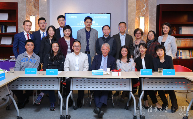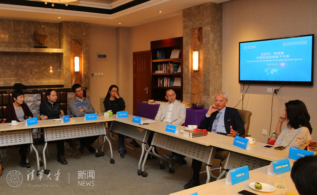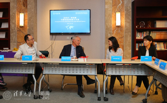 星空online(中国)网11月1日电 10月20日,作为星空体育经济管理学院顾问委员会2016年会议的系列活动之一,清华经管学院顾问委员会委员、纽约大学斯特恩商学院教授、2001年诺贝尔经济学奖获得者迈克尔·斯宾塞教授(A. Michael Spence)与经管学院多位青年教师共进下午茶,并就其学术研究进行了交流。