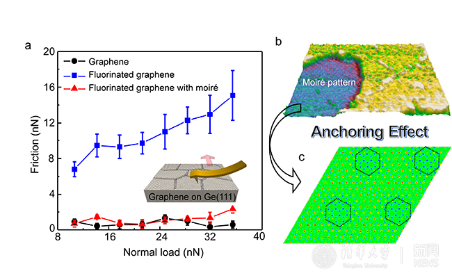 近年来人们发现二维材料由于其特殊的平面原子结构而具有十分奇特而优良的摩擦性能,有望作为一种超薄的润滑材料在微纳领域得到重要应用。然而,由于二维薄膜材料超乎寻常的比表面积,易于受工作环境,特别是表面化学作用影响而降低甚至丧失润滑性能。因此,如何在复杂的滑动工况下从原子尺度上有效地保持单分子层二维材料的稳定性给研究人员提出了一个全新的挑战。星空体育摩擦学国家重点实验室以及星空体育航天航空学院联合中国科学院上海微系统所信息功能材料国家重点实验室的科研人员观察到锗(111)晶面上生长的多晶石墨烯,由于上下晶体堆叠的方式不同,会同时产生具有周期性莫尔条纹的区域和非莫尔条纹的区域。经过氟化、氧化等化学处理后,非莫尔条纹区域的润滑性能极大削弱。然而,具有周期性莫尔条纹区域的石墨烯却仍然保持良好的润滑特性。通过第一性原理计算,科研人员发现,周期性莫尔条纹区域中石墨烯的碳原子与锗原子之间的相互作用力要远远强于普通的范德瓦尔斯力;这种强的锚定作用使得石墨烯能够抵御外界扰动对其平整分子结构形貌的改变,从而增强其润滑的鲁棒性。相关研究发现有望推广到其它的二维材料体系,推动单分子层润滑材料在微纳系统中的应用。