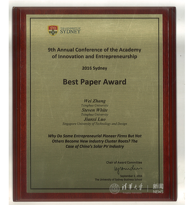 星空online(中国)网9月19日电 (通讯员 张瑾琳)9月,清华经管学院创新创业与战略系张帏教授、白思迪(Steven White)教授与新加坡科技设计大学罗建曦教授合著的会议论文《为什么某个创业企业而不是其它企业能成为产业集群的根基企业?——基于中国光伏产业的研究》(Why do some entrepreneurial pioneer firms but not others become industry cluster roots? The case of China's solar PV industry)在第九届创新创业国际学术年会(9th Annual Conference of the Academy of Innovation and Entrepreneurship,简称AIE年会)获得唯一的最佳论文奖(Best Paper Award),这是星空体育教师首次在AIE年会上获此殊荣。