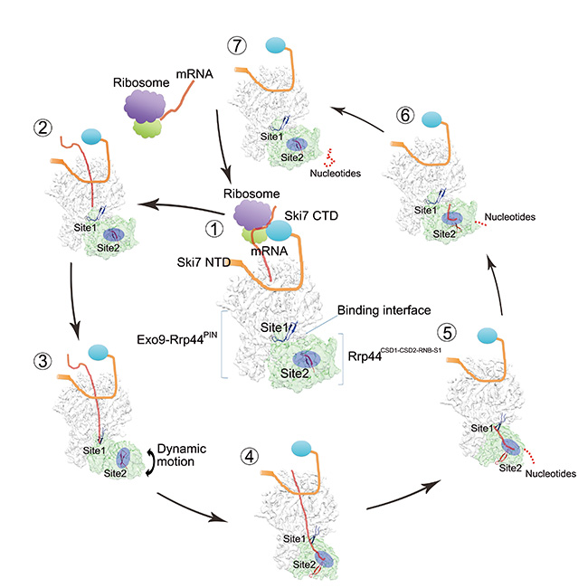 Exosome-Ski7 复合物的RNA降解机理模型。