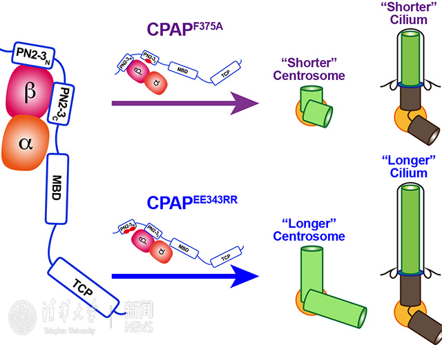 本研究发现一个有趣的现象,PN2-3和微管素之间特殊结合模式为中心粒微管的组装和可控生长提供了分子结构基础。一方面,PN2-3的强微管素结合能力保证了CPAP蛋白能够有效捕获微管素二体,为微管组装提供原料;另一方面,CPAP通过可控的微管素释放,进而实现微管的定向生长。这样CPAP蛋白就像建筑工人一样,主动调控着中心粒或者纤毛微管的聚合与组装。本研究鉴定出两类PN2-3点突变:因为导致CPAP不能有效捕获微管素二体(F375A),或失去了对微管素释放的严谨控制(EE343RR),从而表现出明显的纤毛/中心粒变短或“过长”表型(参见图二)。