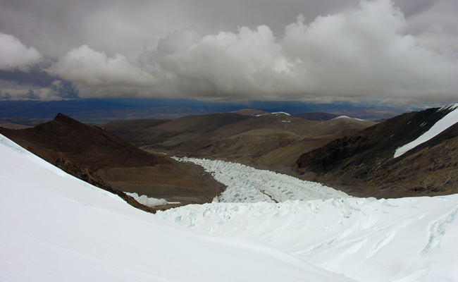 上图显示从印度平原(CEI)向青藏高原西南部(SWTP; A—B)水汽输送的两条路径:1. 传统爬坡(upslope)的路径, 2.新发现的先抬升后平流(up-and-over)的路径,以及它们所对应的降水的剖面图。可以看到先抬升后平流(up-and-over)输送贡献了青藏高原西南部大部分的降水(图中上部红色线所示)。这一现象也被当地的气象观测人员注意到,下图照片显示了源源不断从印度平原进入高原的云和降水。