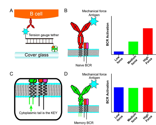 B淋巴细胞作为抗体免疫应答过程中的重要参与者维系着人类的健康,B淋巴细胞的免疫活化进程在其质膜表面的BCR识别外来病原体抗原后启动。该课题组之前的工作揭示B淋巴细胞具有灵敏的机械力感知功能,利用BCR来精确地识别抗原的理化性状。该论文结合基于双链DNA的机械力探针系统和基于全内反射荧光显微镜的高速高分辨率成像系统,对B淋巴细胞感受机械力而启动免疫活化的分子事件进行新角度的可视化研究。该论文发现表达IgM-BCR的初始型B淋巴细胞的免疫活化对机械力信号敏感,呈现低、中、高的阶梯型多阈值效应。其中,IgM-BCR在高阶、而非中或低阶机械力阈值的活化依赖于Myosin IIA和Integrin。与初始型B细胞相比,表达IgG-BCR 或IgE-BCR的记忆性B淋巴细胞的免疫活化需要的机械力信号的阈值极低。这一有趣的发现从一个崭新的角度为记忆性B淋巴细胞在识别病原体抗原后,展现的快速高效的免疫活化以及后续增强的记忆性抗体应答提供了新的解释。