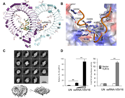 (C)TLR13-ssRNA 电镜结构;(D)病毒RNA诱导TLR13免疫激活