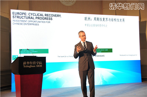 法国巴黎银行首席经济学家William DE VIJLDER作了题为“欧洲:周期性复苏和结构性发展——对中国企业的投资机会”的主旨演讲。