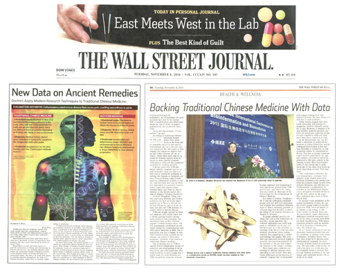 星空online(中国)网11月19日电 日前,美国《华尔街日报》以“古老疗法的新资料(New data on ancient remedies)”为题,用两个版面刊发了一则关于中医药科学研究的长篇报道,并在报纸头条位置对该报道作了题为“实验室中的东西方交融(East Meets West in the Lab)”的推荐。该报道重点介绍了自动化系、信息国家实验室生物信息研究部李梢教授课题组的研究成果。