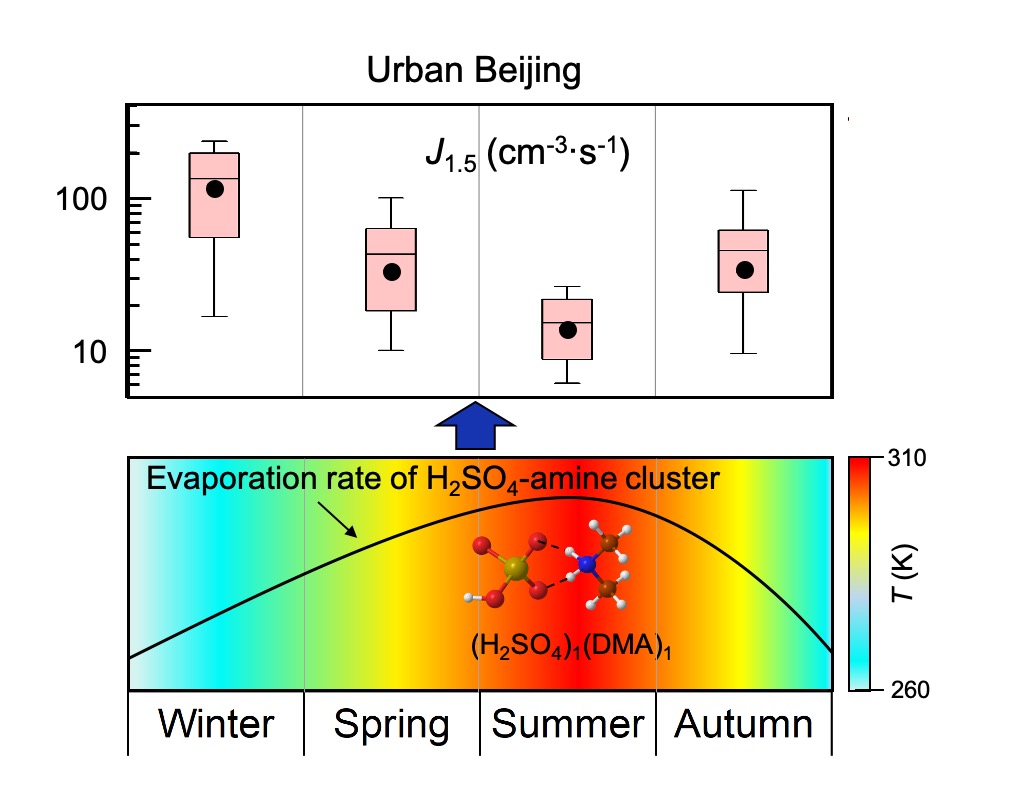 团队通过长期的大气观测以及气溶胶动力学理论分析,发现北京、上海和南京等特大城市具有较高的背景气溶胶浓度和气态前体物硫酸浓度,其纳米颗粒物生成速率显著高于清洁大气环境;而高浓度背景气溶胶的去除作用会抑制硫酸、有机胺等气态分子、分子团簇和新生成纳米颗粒物的存活,降低其浓度和大气停留时间,进而成为城市大气环境中新粒子生成事件是否发生的主控因素。但是,经典成核理论将蒸发过程作为主要的限速步骤,忽视了背景气溶胶的重要影响。此外,研究发现温度是引起北京新粒子生成频率和强度呈现显著季节变化的主控因素。温度越高,新粒子生成关键酸碱团簇的蒸发速率越大,进而导致在温度最高的夏季时新粒子生成速率最低。考虑到不同大气环境温度的显著变化,该发现可能会对全球有着广泛的影响。同时,团队提出在污染城市大气环境中评估新粒子生成的生长速率和增长速率等主要参数时,需正确地考虑背景气溶胶的影响。